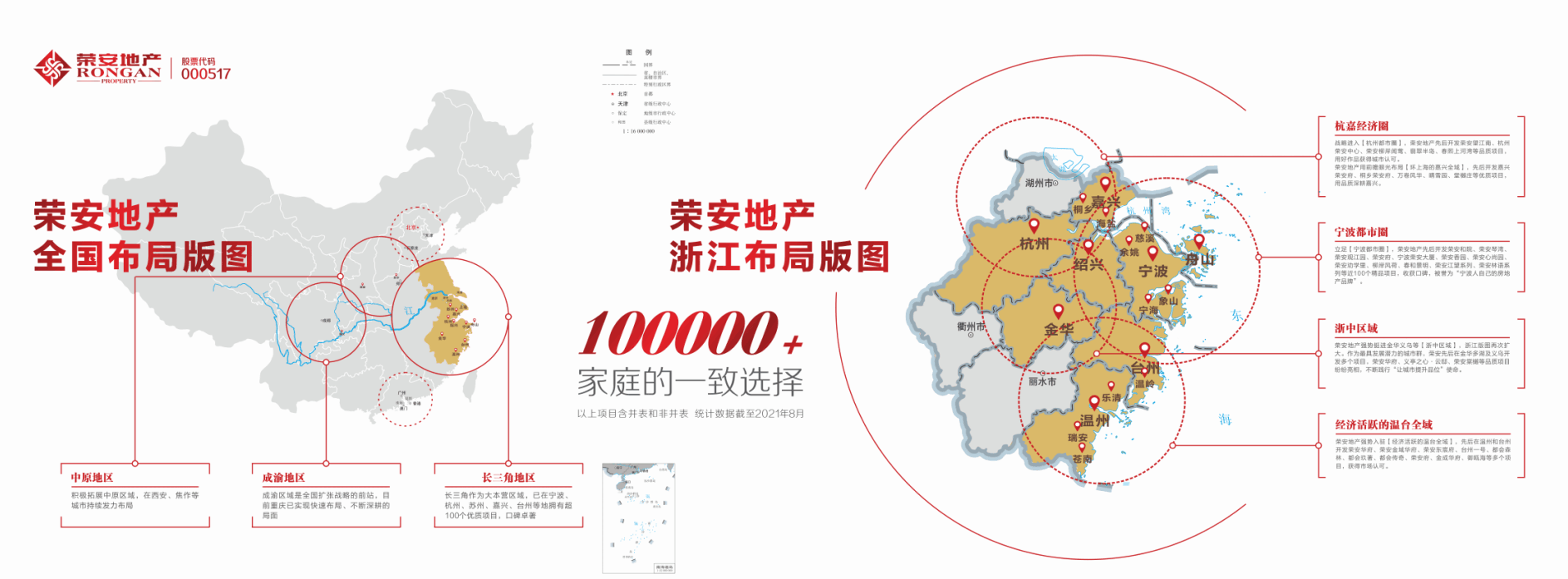 榮安地產(chǎn)一直扎根寧波、深耕長三角、面向全國進(jìn)行戰(zhàn)略布局,已在寧波、杭州、臺(tái)州、溫州、嘉興、蘇州、重慶、西安、紹興、金華等城市擁有上百個(gè)優(yōu)質(zhì)項(xiàng)目,開發(fā)業(yè)態(tài)涵蓋住宅、商業(yè)、寫字樓等,總開發(fā)面積1000多萬平方米,是超100000戶家庭的一致選擇。企業(yè)綜合實(shí)力持續(xù)位居國內(nèi)房地產(chǎn)企業(yè)前列,獲“中國房地產(chǎn)開發(fā)企業(yè)百強(qiáng)”、“中國房地產(chǎn)上市企業(yè)百強(qiáng)”、“中國民營企業(yè)500強(qiáng)”、“中國房地產(chǎn)開發(fā)企業(yè)區(qū)域運(yùn)營10強(qiáng)”、“中國房地產(chǎn)開發(fā)企業(yè)品牌價(jià)值華東10強(qiáng)”、 “浙江省服務(wù)業(yè)百強(qiáng)企業(yè)”等榮譽(yù)。
